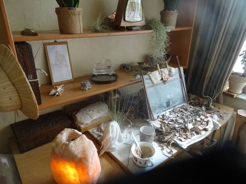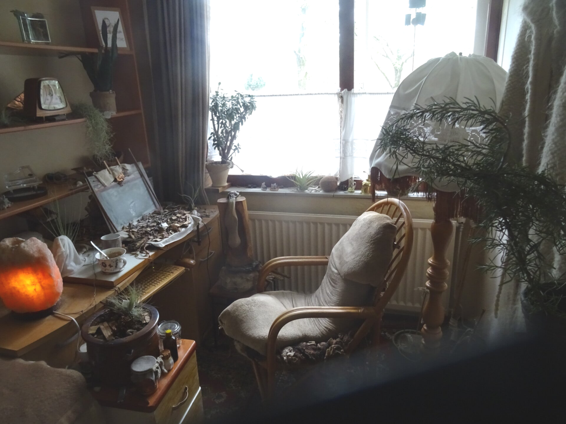 Afgelopen jaren heb ik een lang en diep traject afgelegd, om mijn gezondheid te verbeteren, en om te kunnen functioneren. De vele wegen hielpen mij. Er zat in de vele wegen één stabiele factor die ze gemeen hadden, en dat was dat mijn hart de doener was. Ik gebruikte middelen die niemand kent, of gebruikt om zo te genezen. Je kunt het je niet voorstellen, maar zelfs scripts op mijn computer deden het werk. Ooit kon ik nog geen 10 minuten achter de computer werken, omdat ik last had van de straling. Ik merkte al gauw dat het niet de straling op zichzelf is, want de natuur zendt ook straling, denk maar aan de zon. Het bleek de electromagnetische verstoring te zijn in de computer, die communiceerde met de straling (= electromagnetisme) van het beeldscherm. In de computer moest het werk gebeuren. Mijn Browser had ik een bepaald moment vol met Natuurlijke Materialen, zoals koperbrokken uit de Natuur, Zilver, planten, zowel sterke geneeskrachtige als zachte verzachtende planten, webcams van natuurgebieden, kristallen, mineralen, CSS-instellingen (website-techniek) om de foto's beter in beeld te brengen, en de werking te versterken (kleuraanpassing / vergroten etc.). Dit alles communiceerde geneeskrachtig met de daadwerkelijke fysieke versies van Licht brengende elementen, op mijn laptop, erin (in de CD-lade), onder, en achter mijn laptop. KimyaTra Kwam behoorlijk snel KimyaTra voeden, Met KimyaTra Natuurmiddelen. Licht in KimyaTra heeft mij genezen. De KimyaTra middelen Greep mij aan, De Waarde was zo Hoog, dat ik niet begreep dat niet iedereen dit heeft. De Waarde kwam door deze middelen uit mijn Hart. De middelen waren van grote Waarde. Nog groter was de Waarde van het Hart. Hieronder is het voorwerp rechts naast de kop, mijn laptop destijds.